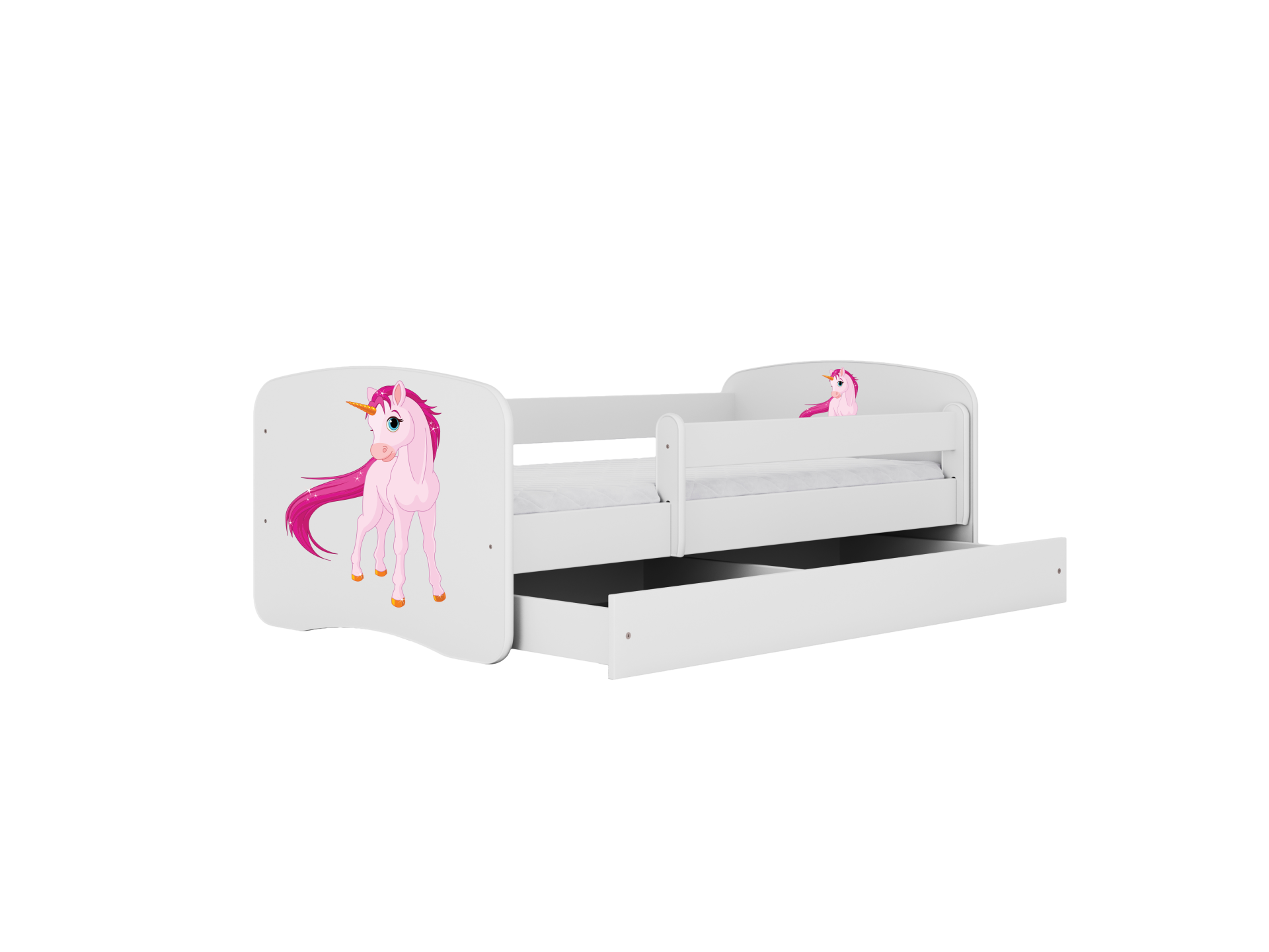 Babydreams juniorseng med enhjørning, m. madras, sengehest og skuffe - hvid laminat (180x80)