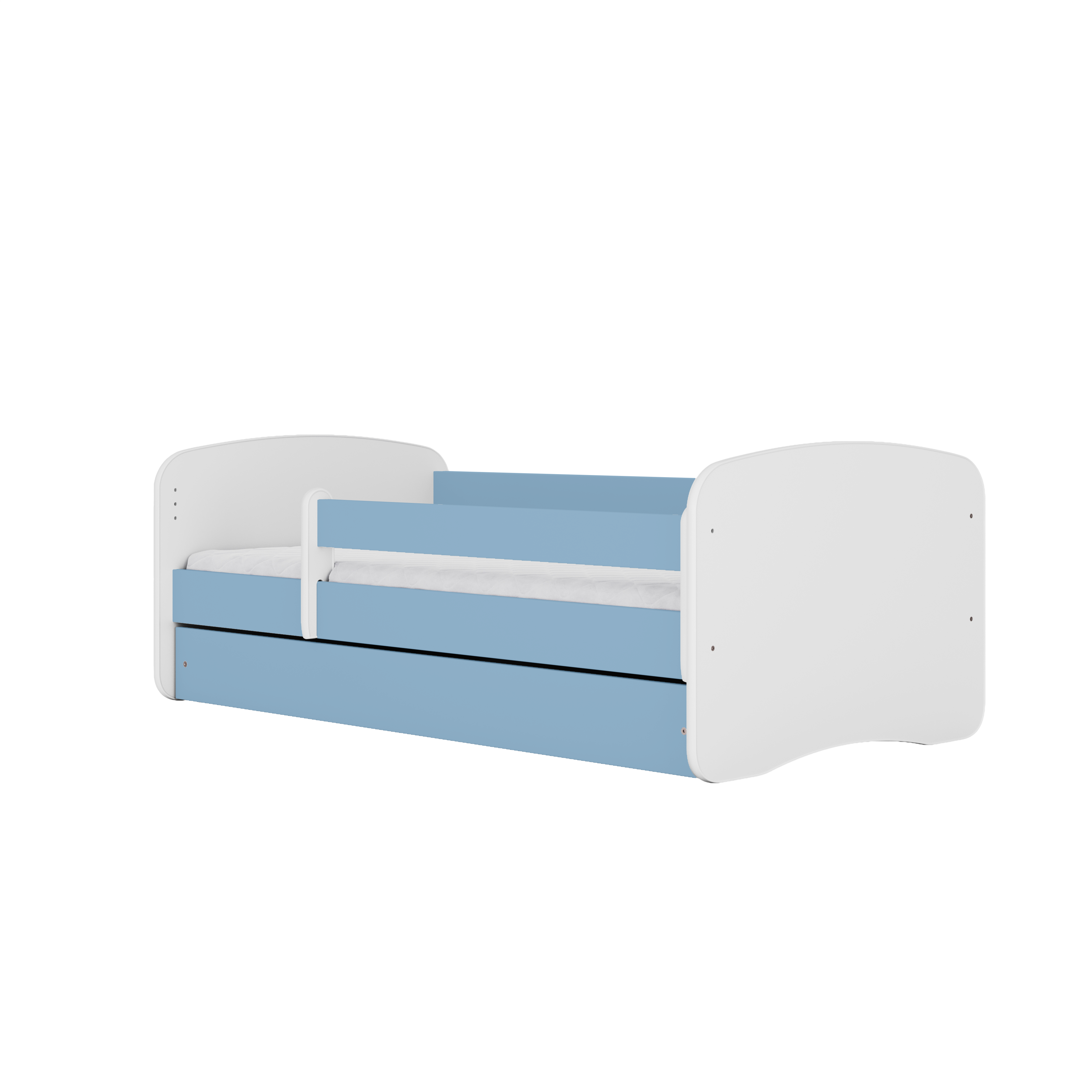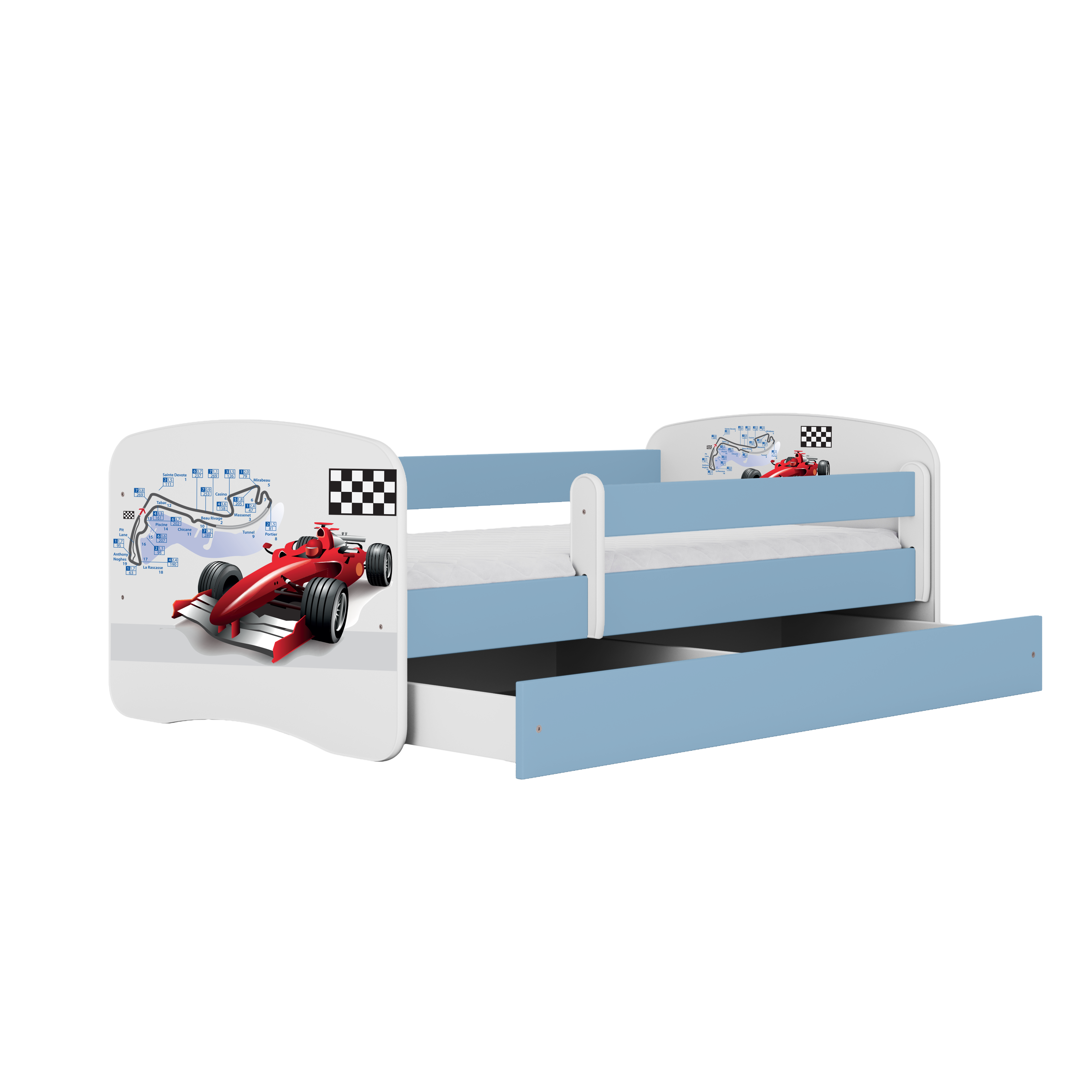 Babydreams juniorseng med racerbil, m. madras, sengehest, skuffe - hvid og blå laminat (140x70)