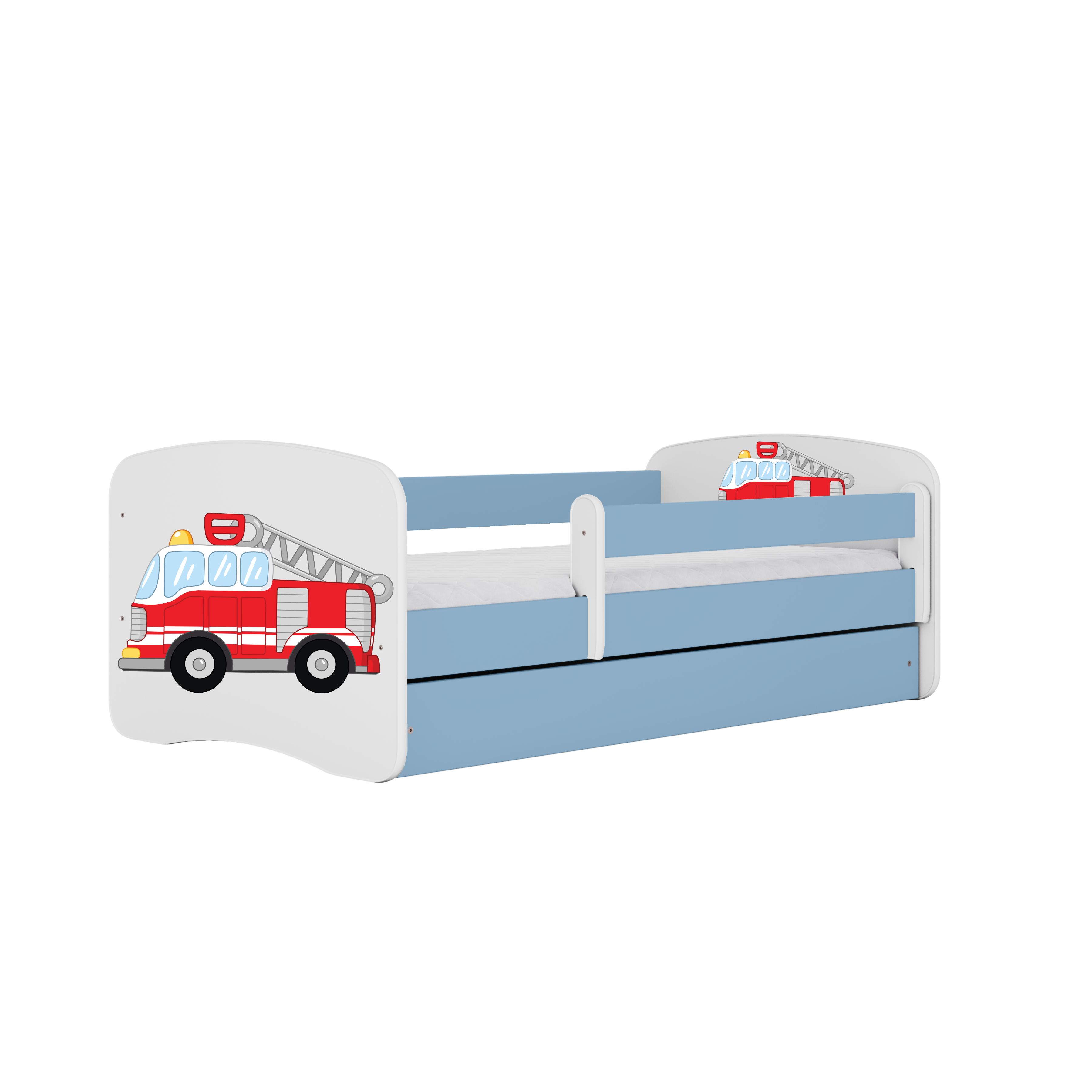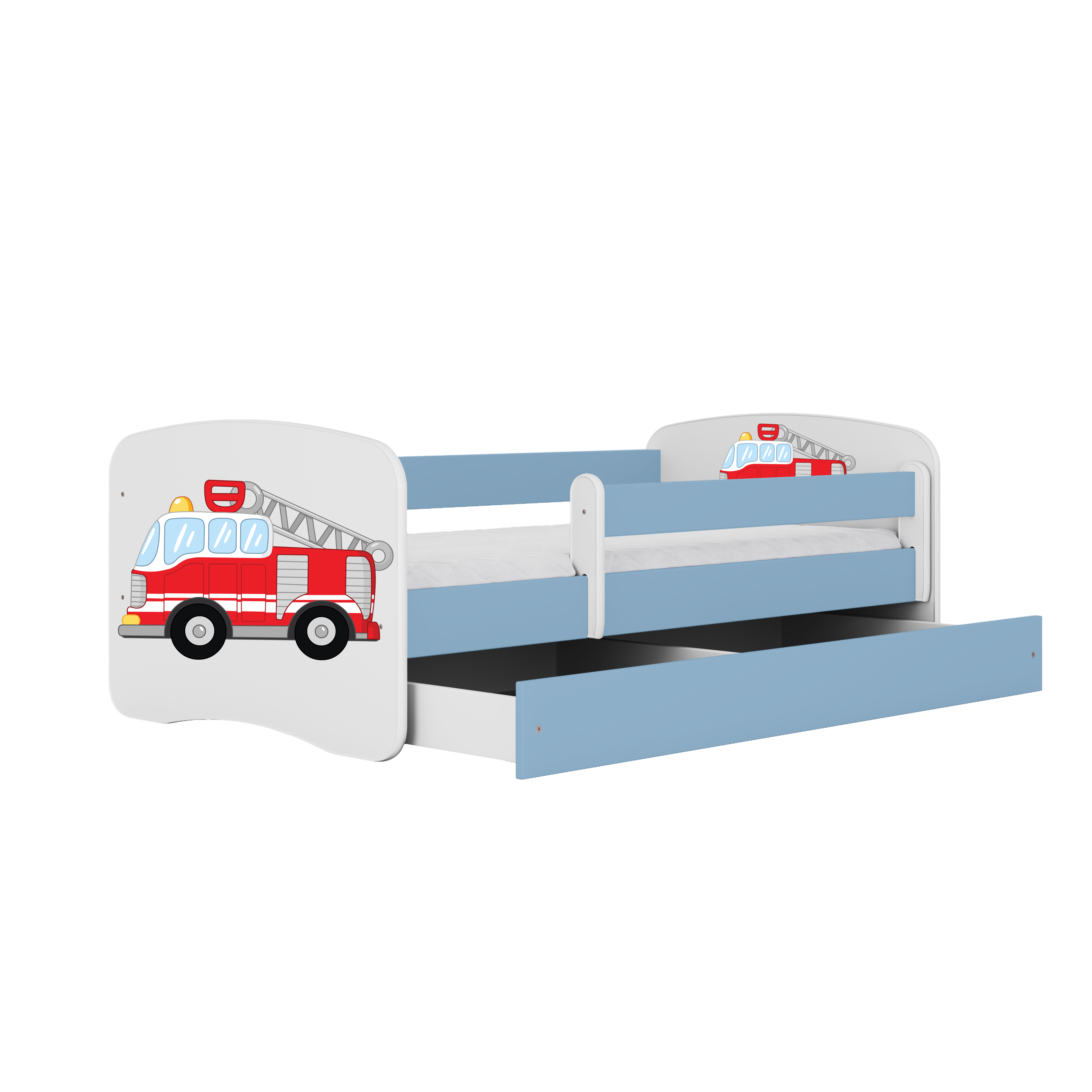Babydreams juniorseng med brandbil, m. madras, sengehest, skuffe - hvid og blå laminat (140x70)