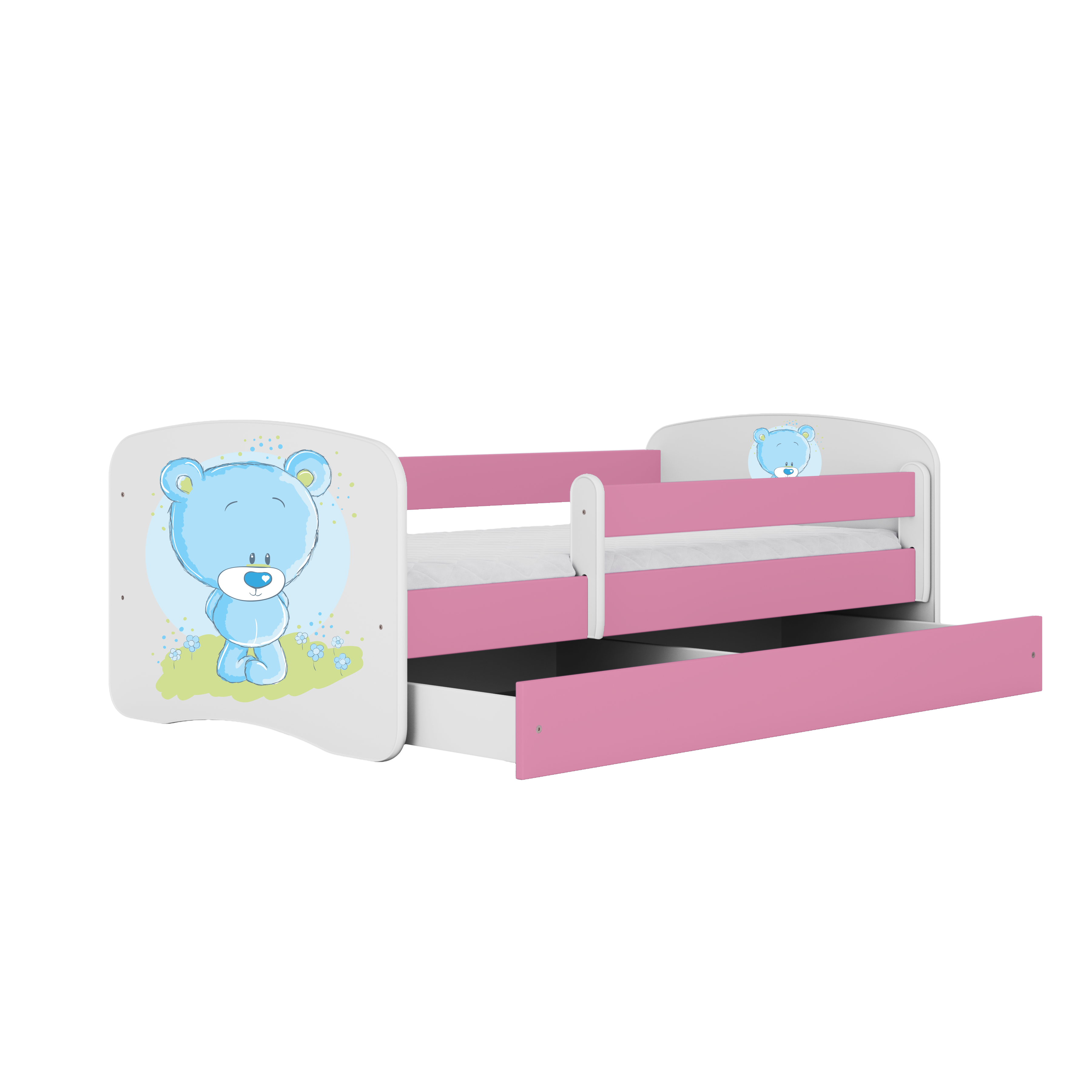 Babydreams juniorseng med blå bamse, m. madras, sengehest, skuffe - hvid og lyserød laminat (160x80)
